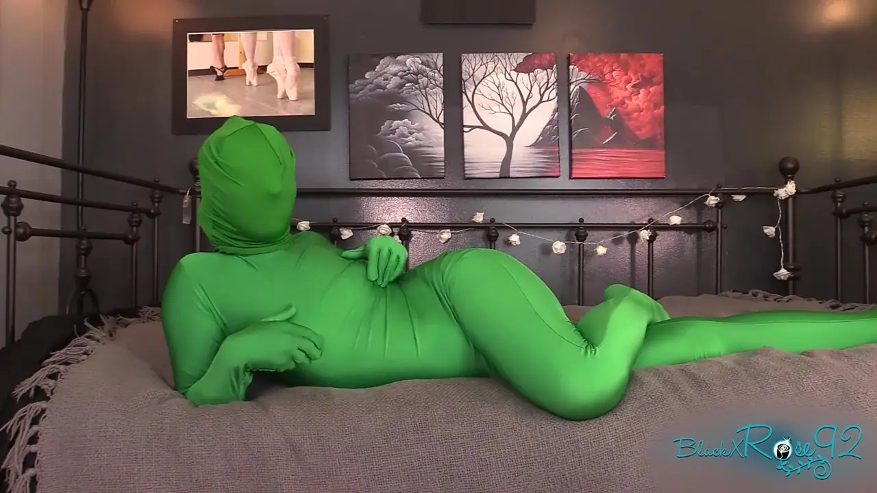 Black-haired MILF with voluptuous body wearing a green zentai suit and hood. She shows off her curves while teasing with a riding motion. He plunges into her wet pussy, making her moan as he pounds her relentlessly.