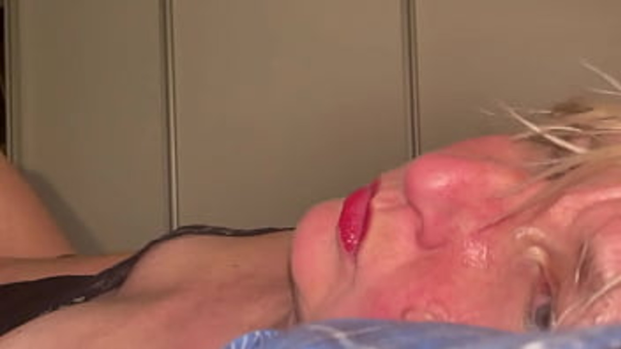 Pretty slutwife Anna sits in her pretty dress with red lips as she masturbates, moaning loudly. She plays with her pretty lips while rubbing her clit. Her lipstick smudges a bit as she cums, leaving a mess on her leather lingerie.
