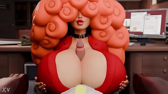 A seductive, busty redhead milf grinds on her boss's cock while he sits at his desk. She deep throats his hard member before he pounds her from behind. He blows his load all over her big boobs, promoting her to the next level.