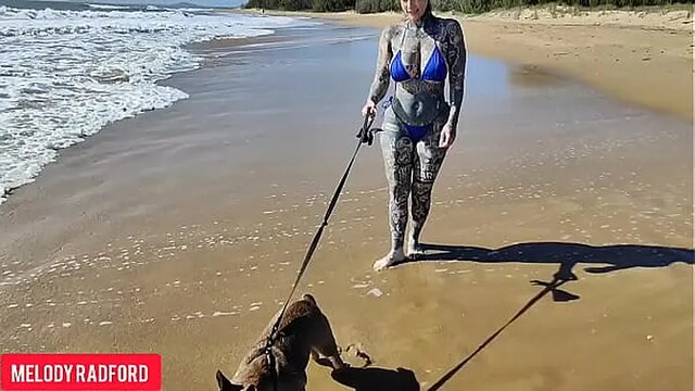 A mature, thick-bodied woman with massive tits and a big butt confidently struts along the public beach in a revealing bikini. She draws the eyes of all the guys as she walks. Her voluptuous figure and toned body make her a sight to behold.