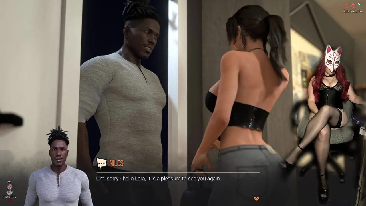 Gamer girl cosplays as Lara Croft for a sexy dinner. She teases him with her long legs and beautiful face. They end up fucking passionately after the meal.