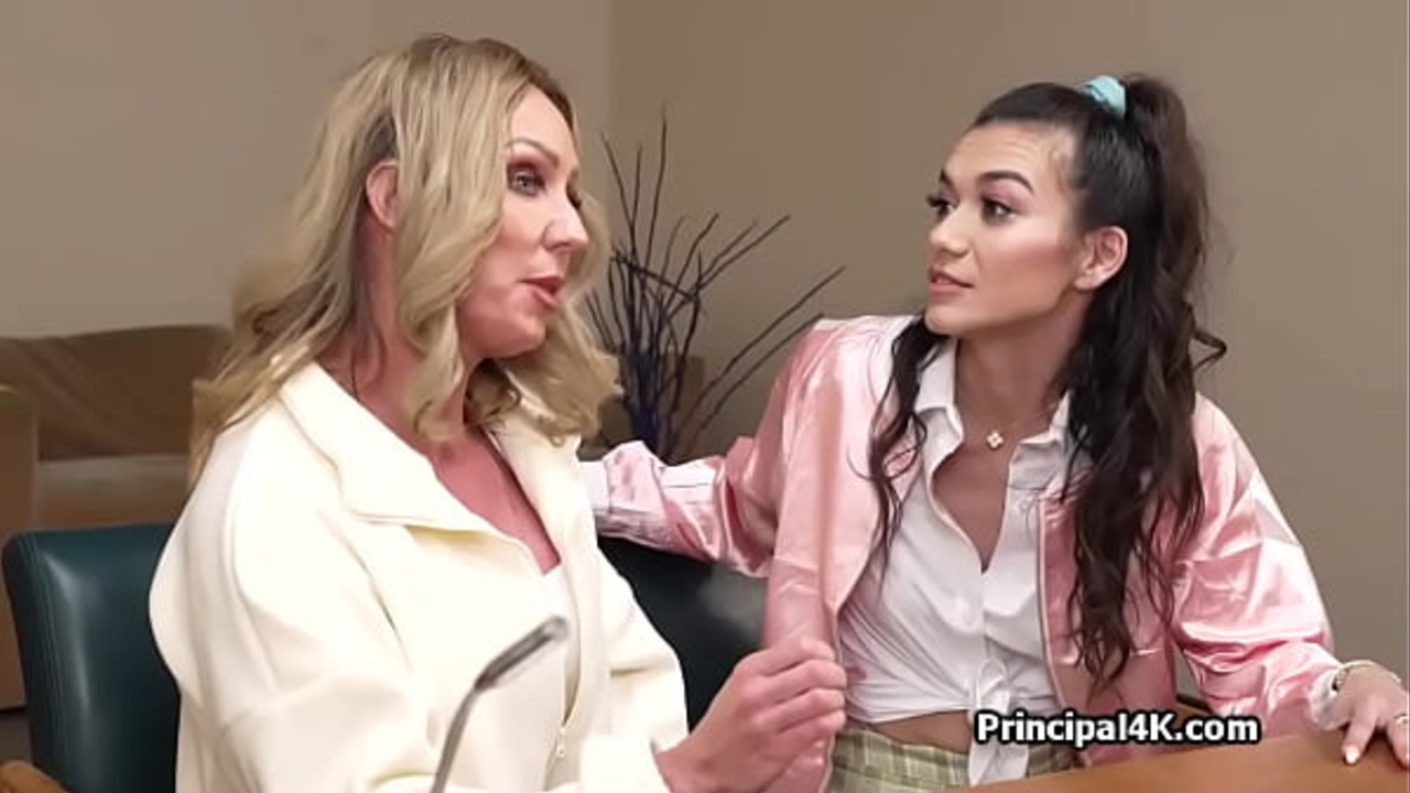 A mature brunette milf teacher gets down on her knees and sucks the principal's dick. A busty teen coed joins in and humps his dick while he pounds both of them. They moan as they get a hardcore creampie in the office.
